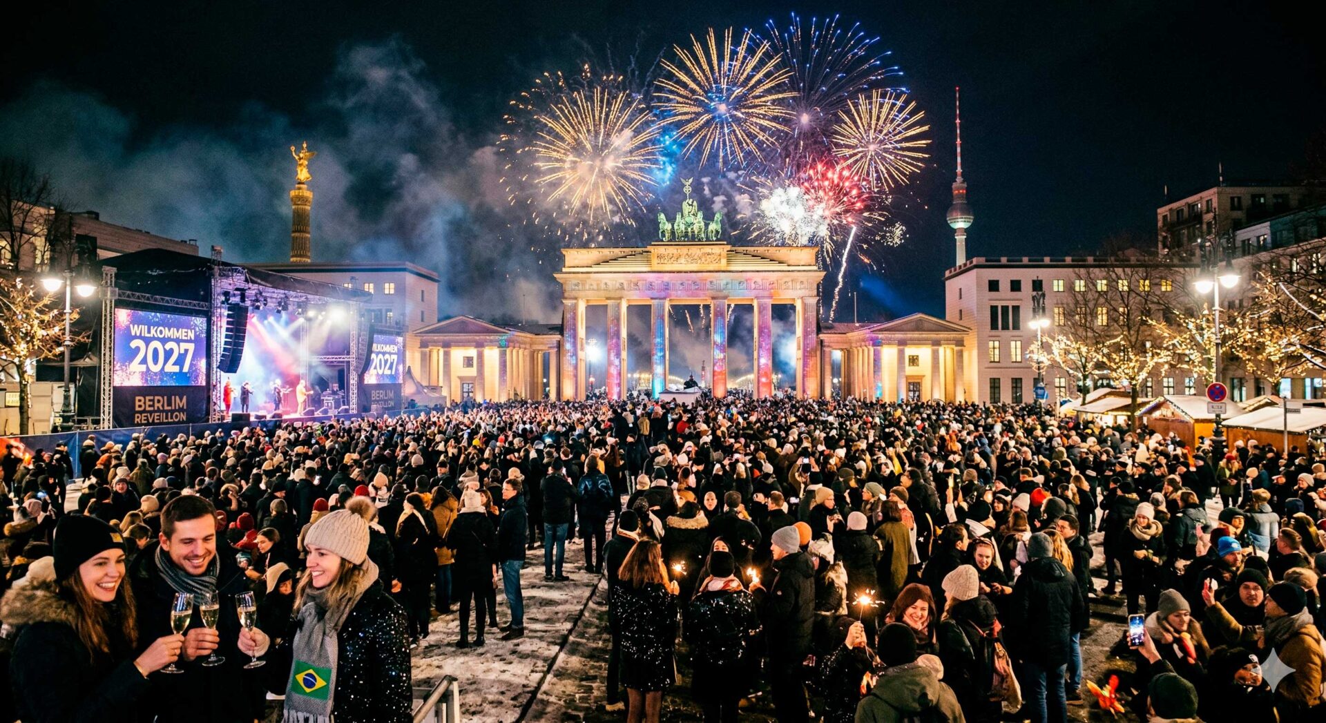 - Portão de Brandemburgo: O coração da festa. É aqui que acontece a maior celebração de rua da Alemanha. Um palco gigantesco recebe DJs e bandas internacionais, culminando em uma contagem regressiva emocionante e um show de fogos de tirar o fôlego sobre a Pariser Platz.