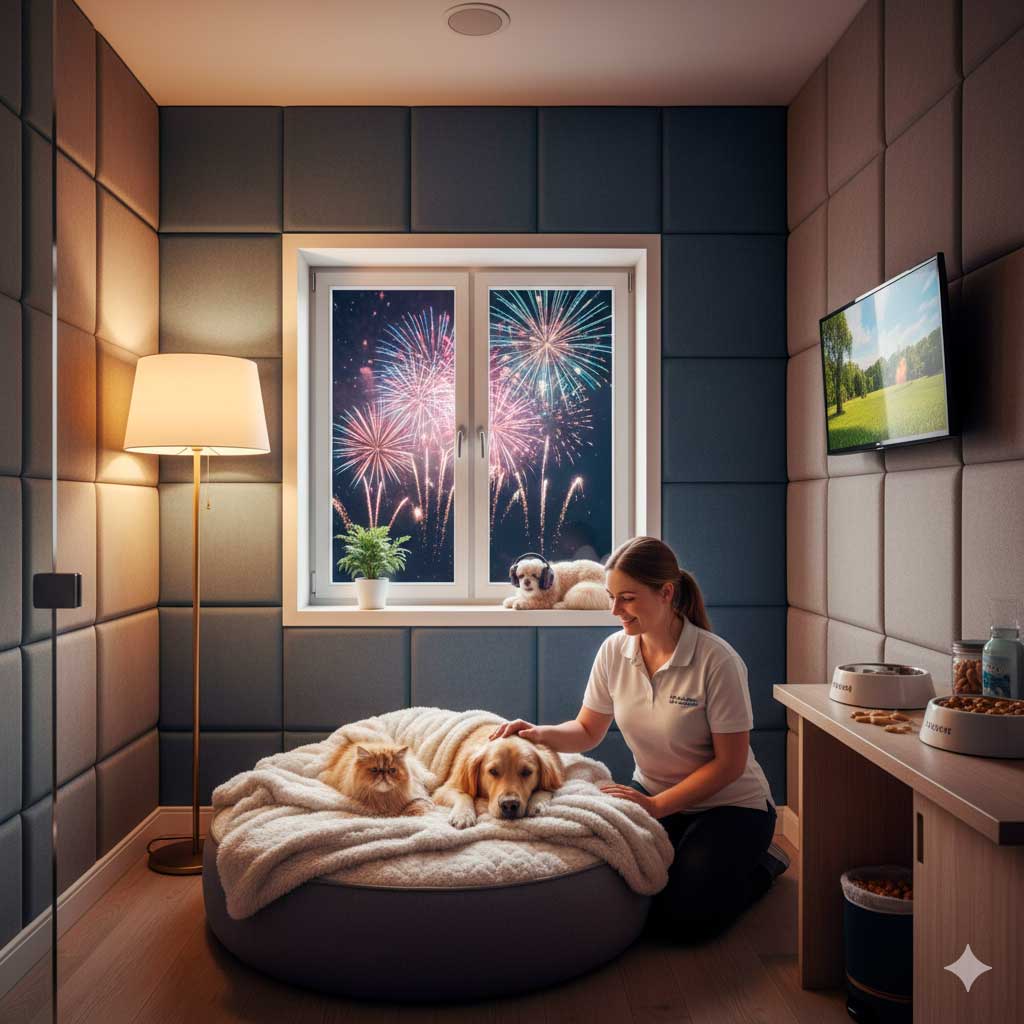 - Vantagens: Oferecem monitoramento profissional, atividades programadas e socialização. Muitos hotéis e creches de qualidade têm estrutura à prova de som ou áreas internas seguras para isolar os animais do barulho intenso da virada.